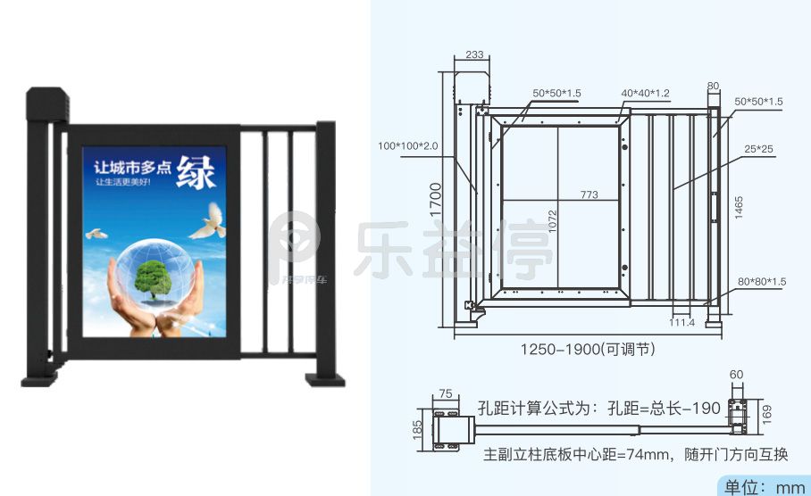 箱体尺寸1.25-1.8米可拉伸(含门柱可延长到1.9米, 需单独加1条竖杆),主立柱2.0mm 板材